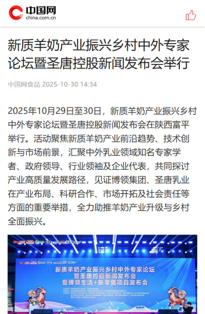 10月29日,在各级政府、羊乳行业权威单位及众多业内人士的瞩目与支持下,博领集团、圣唐乳业、博羚乳业联合承办的“新质羊奶产业振兴乡村中外专家论坛暨圣唐控股新闻发布会暨博领生活+新零售项目发布会”在陕西富平成功举办。