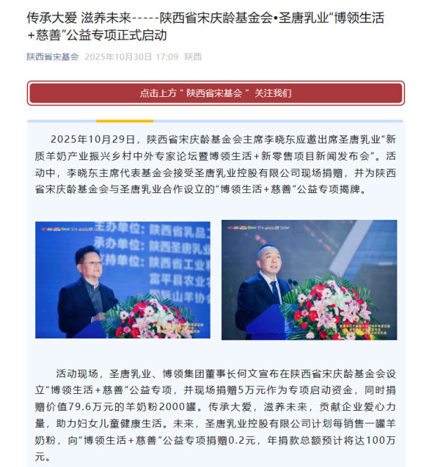 博领集团、圣唐乳业董事长何文受邀接受采访:“下一步,我们将和清华大学营养与运动中心成立联合研发中心,研发更多羊奶产品。未来,也将加大对圣唐品牌的宣传力度,打造中国民族羊乳品牌,让更多的国人甚至是全球的消费者,都能对陕西羊奶、圣唐羊奶有更多的认识,大力发展羊乳新质生产力的同时,发展实体经济。”