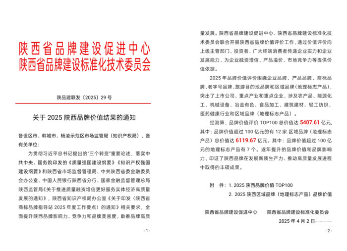 本次品牌价值评价工作由陕西省市场监督管理局、陕西省知识产权局联合指导,评价结果在2025陕西品牌发展交流大会上重磅揭晓,具有严谨的专业性和权威性。