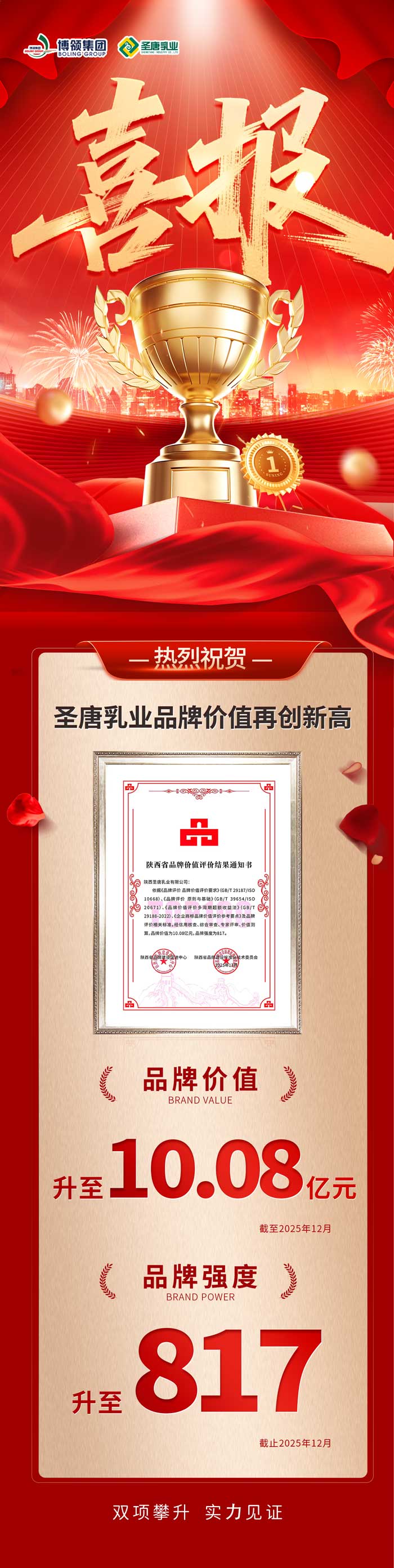 12月26日,2025陕西品牌发展交流大会在西安圆满举办,圣唐乳业登榜陕西品牌价值第55位,品牌价值由9.26亿元跃升至10.08亿元,成功突破十亿大关,品牌强度上升至817。