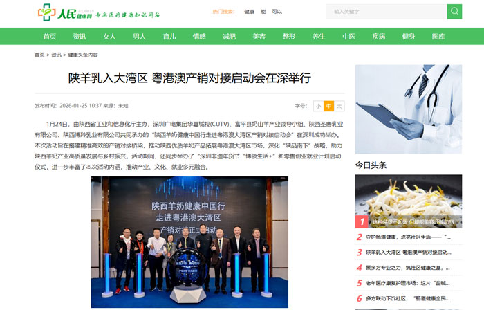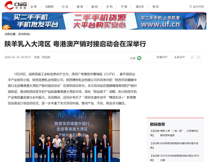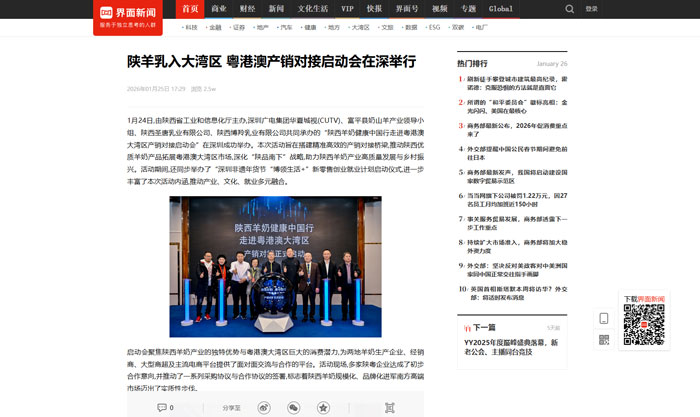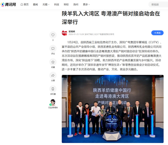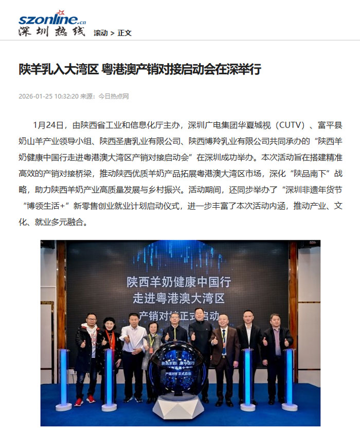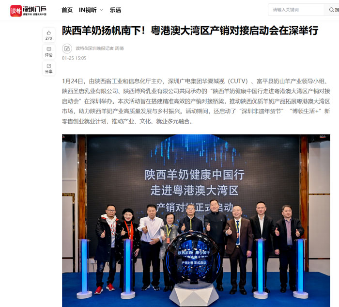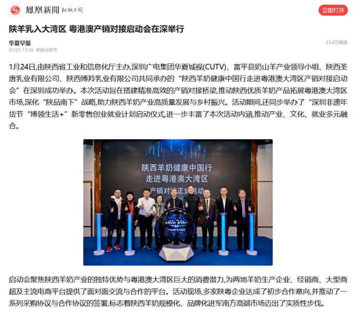 1月24日,由博领集团、圣唐乳业、博羚乳业联合承办的"陕西羊奶健康中国行走进粤港澳大湾区产销对接启动会"在深圳圆满举办。同期举办的"深圳非遗年货节"及"博领生活+新零售创业就业计划"启动仪式,成功实现了产业推广、文化传承与就业创新的有机融合,为传统羊乳产业注入了新的发展活力。活动一经发布,受到了中华网、搜狐新闻、界面新闻、腾讯新闻、凤凰新闻、财经生活等多家主流媒体深度报道。